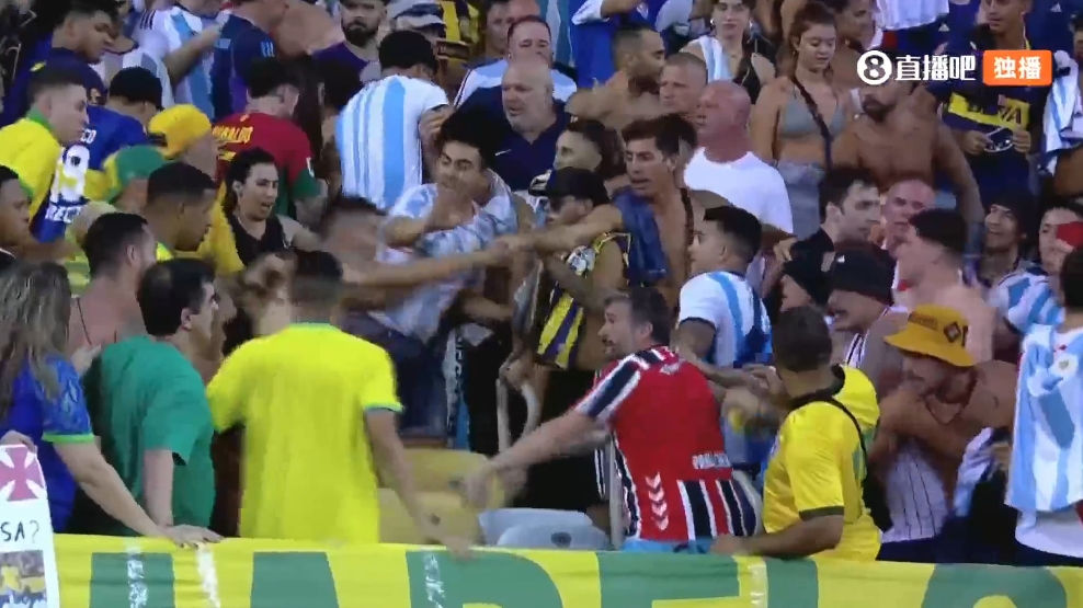 11月22日讯 南美区世预赛,巴西主场对阵阿根廷。比赛还未开始,看台上的球迷已经打成一片!