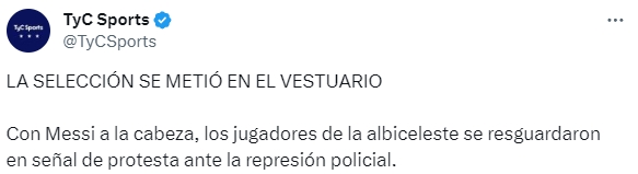 据阿根廷媒体TYC表示,阿根廷队这是在抗议巴西警察对阿根廷球迷的镇压。