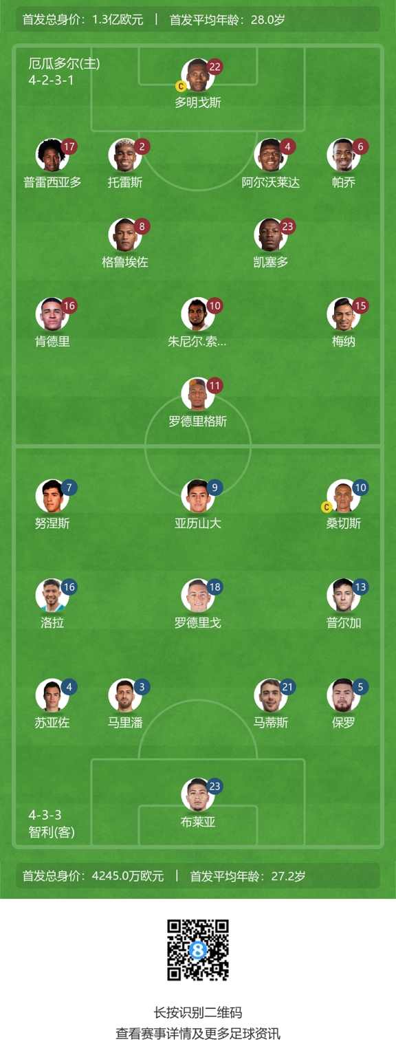厄瓜多尔vs智利首发:桑切斯、凯塞多先发,坎帕纳替补