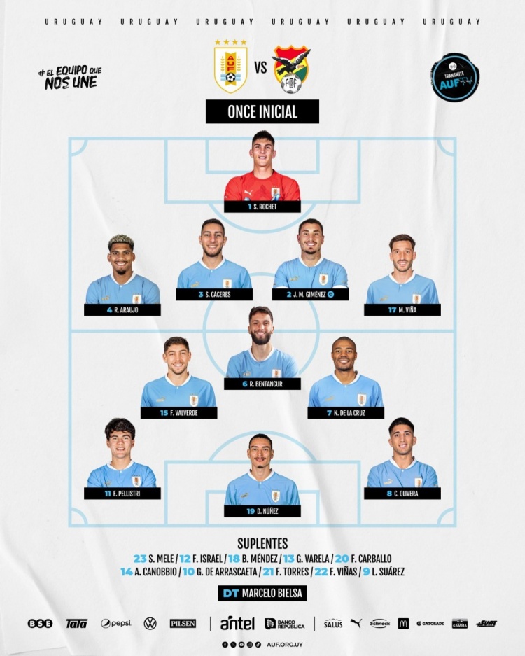 乌拉圭vs玻利维亚首发:苏牙替补,努涅斯、巴尔韦德出战