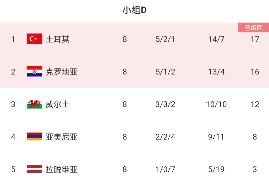 欧预赛D组收官,土耳其头名出线,克罗地亚小组第二晋级,威尔士进附加赛。