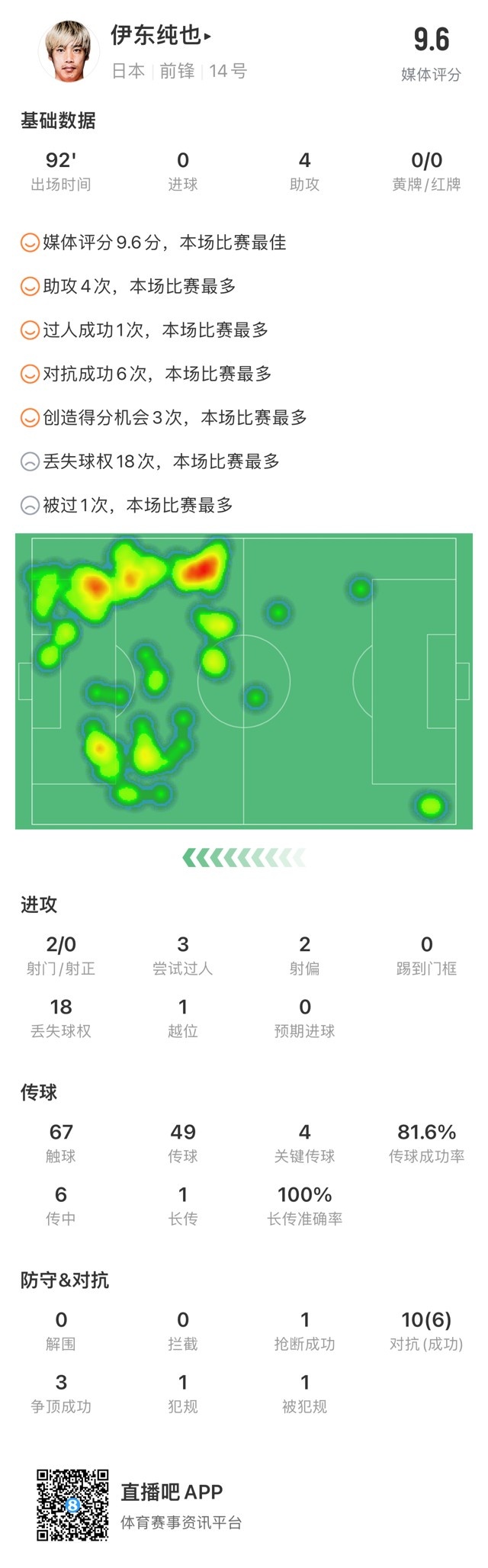 伊东纯也数据:助攻大四喜获评全场最高9.6分,多项数据全场最多