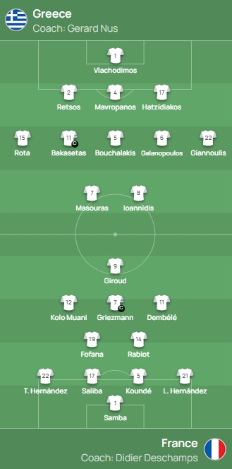 11月22日讯 北京时间03:45,欧洲杯预选赛第10轮,法国客场挑战希腊。赛前,双方公布首发名单。