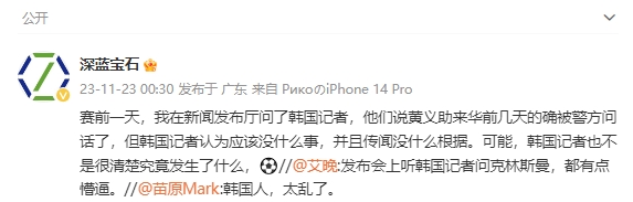 而新快报足球记者王敌也在微博上谈到了黄义助的这次事件,王敌在微博写到:赛前一天,我在新闻发布厅问了韩国记者,他们说黄义助来华前几天的确被警方问话了,但韩国记者认为应该没什么事,并且传闻没什么根据。可能,韩国记者也不是很清楚究竟发生了什么,⚽️