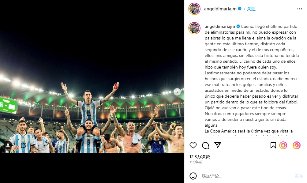 迪马利亚写道:“好吧,我们踢完了今年的最后一场比赛。人们的欢呼声让我的灵魂充满了力量,我无法用言语来形容这种感情,每一分每一秒我都沉浸其中。”