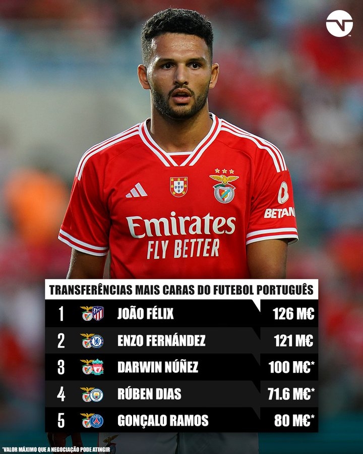 11月23日讯 昨天,巴黎官方宣布,俱乐部将买断本菲卡中锋贡萨洛-拉莫斯。多家媒体确认,这笔买断费的总价为8000万欧元。据TNT体育统计,在出售拉莫斯后,葡萄牙历史最贵的5笔转会全都出自本菲卡。