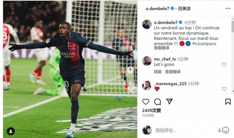 登贝莱社媒:继续保持良好势头,现在专注于对纽卡的比赛