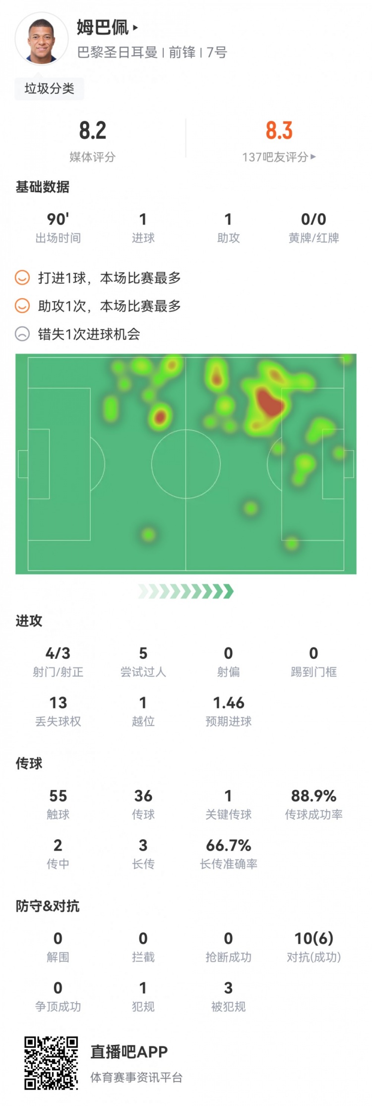 姆巴佩数据:1进球1助攻 错失1次得分机会 评分8.2分仅次登贝莱
