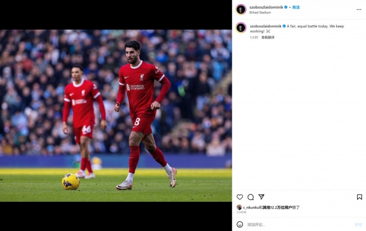 11月26日讯 利物浦1-1战平曼城,赛后,首发出战73分钟的利物浦中场索博斯洛伊在社媒晒照。