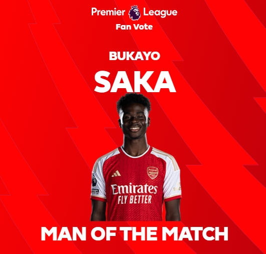贡献绝杀球助攻!英超官方:萨卡当选阿森纳1-0布伦特福德全场最佳