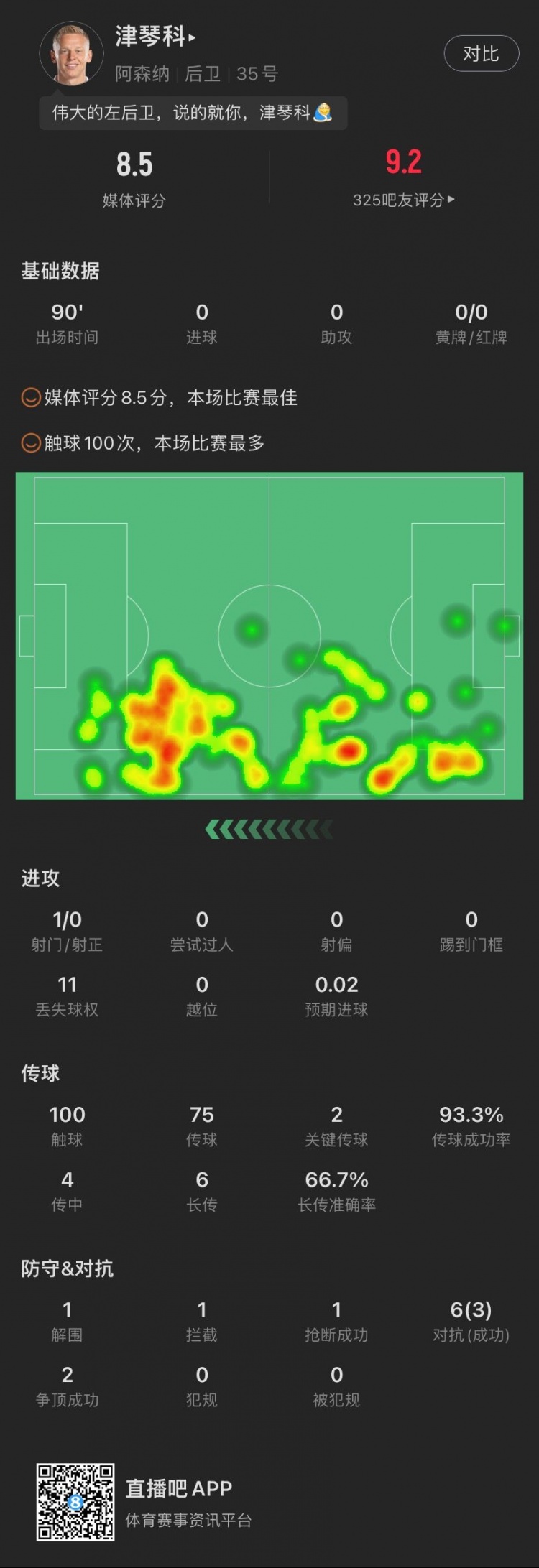 津琴科本场数据:贡献门线解围,2次关键传球,评分全场最高