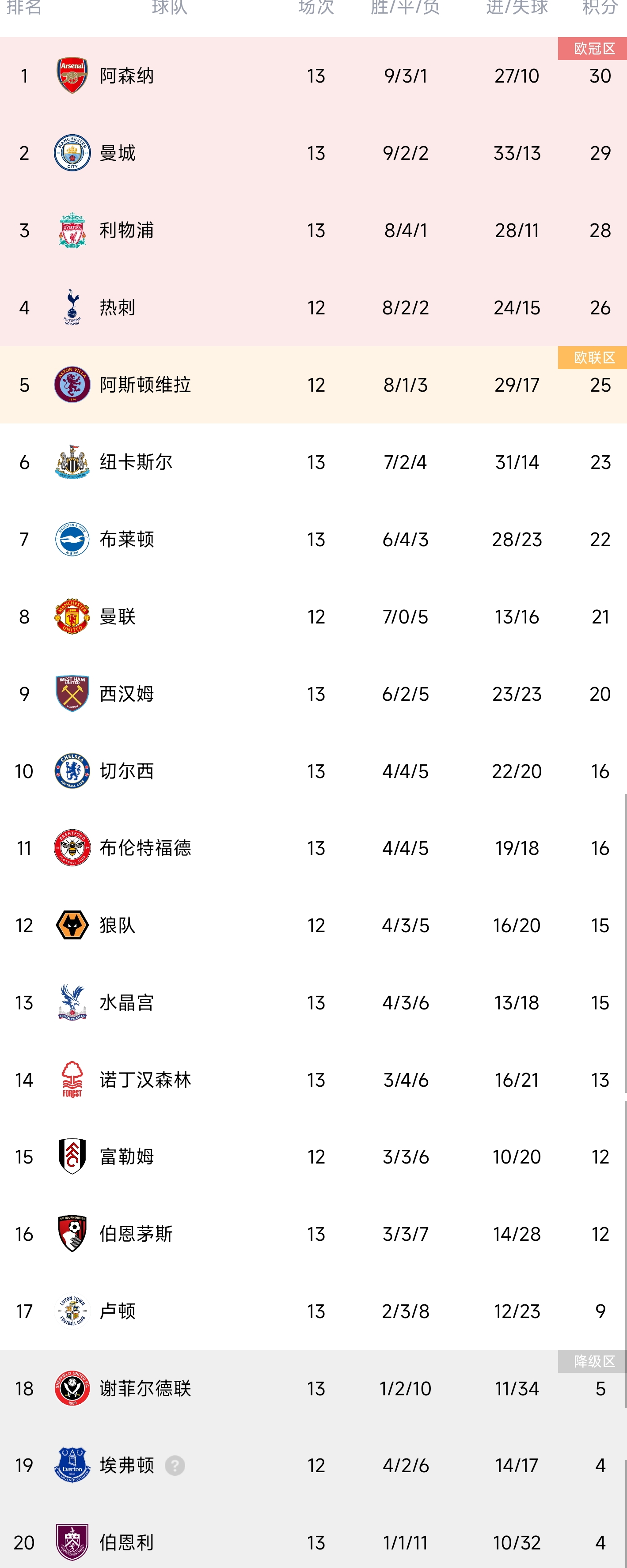 完整积分榜,阿森纳30分第一,曼城29第二,利物浦28第三。