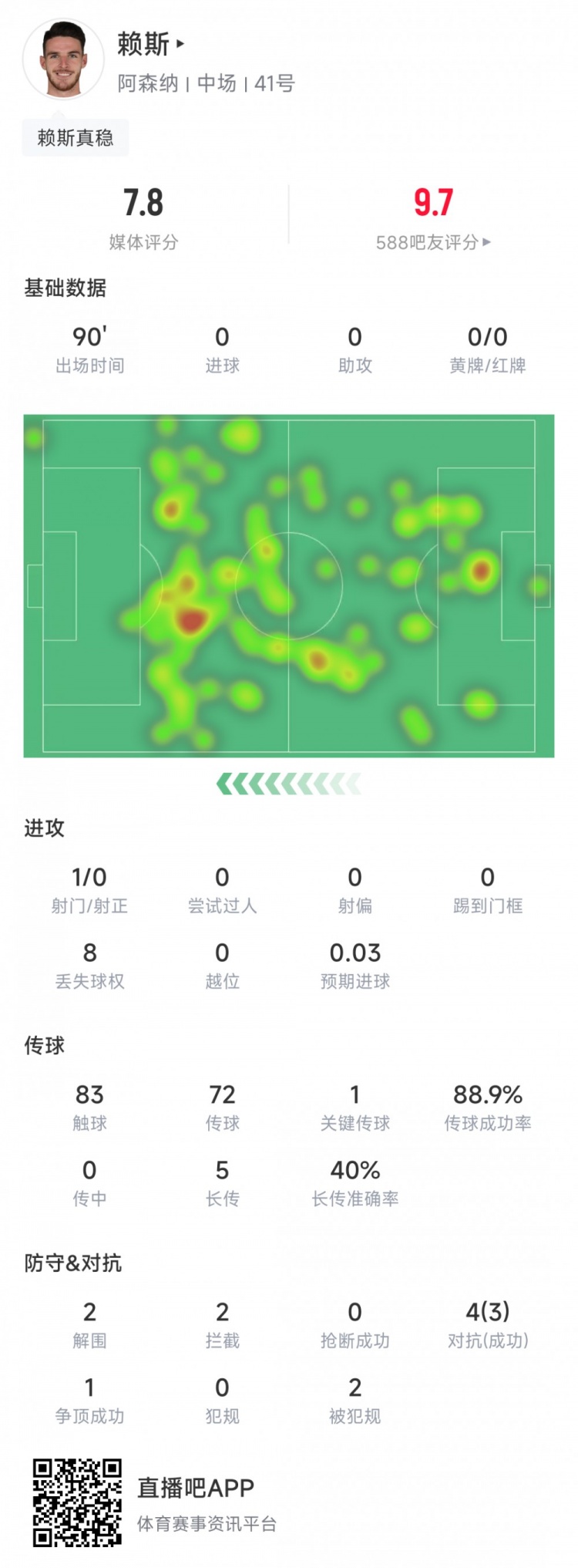 赖斯全场数据:1次关键传球,传球成功率88.9%,2次解围