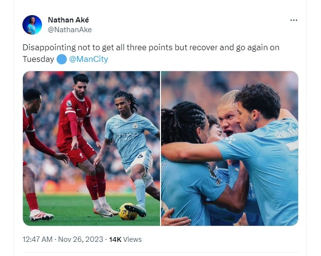 11月26日讯 英超第13轮,阿克送出助攻,曼城主场1-1战平利物浦。赛后,阿克更新了社媒:遗憾没能全取三分,不过需要在下周欧冠恢复过来。下周欧冠小组赛第5轮,曼城将