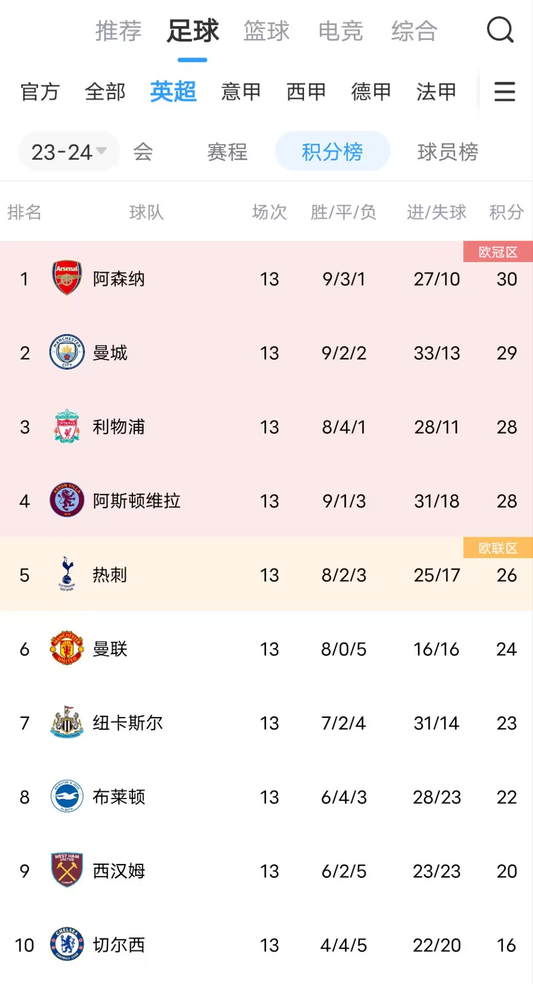 本轮英超结束,传统BIG6纷纷归位,除切尔西外,曼城、利物浦、阿森纳、热刺、曼联占据联赛前六。