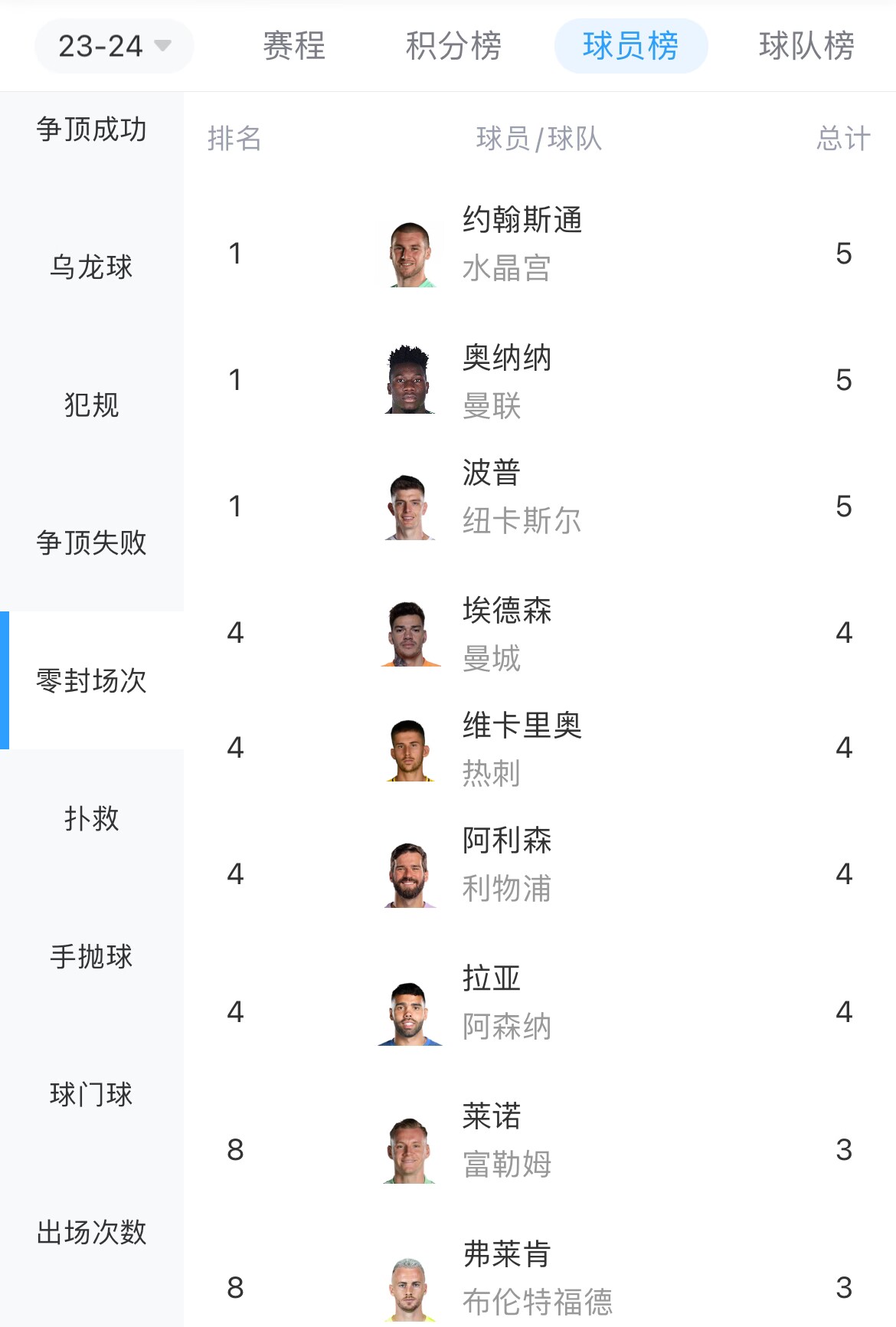 好起来了!英超零封榜:奥纳纳5次并列第一
