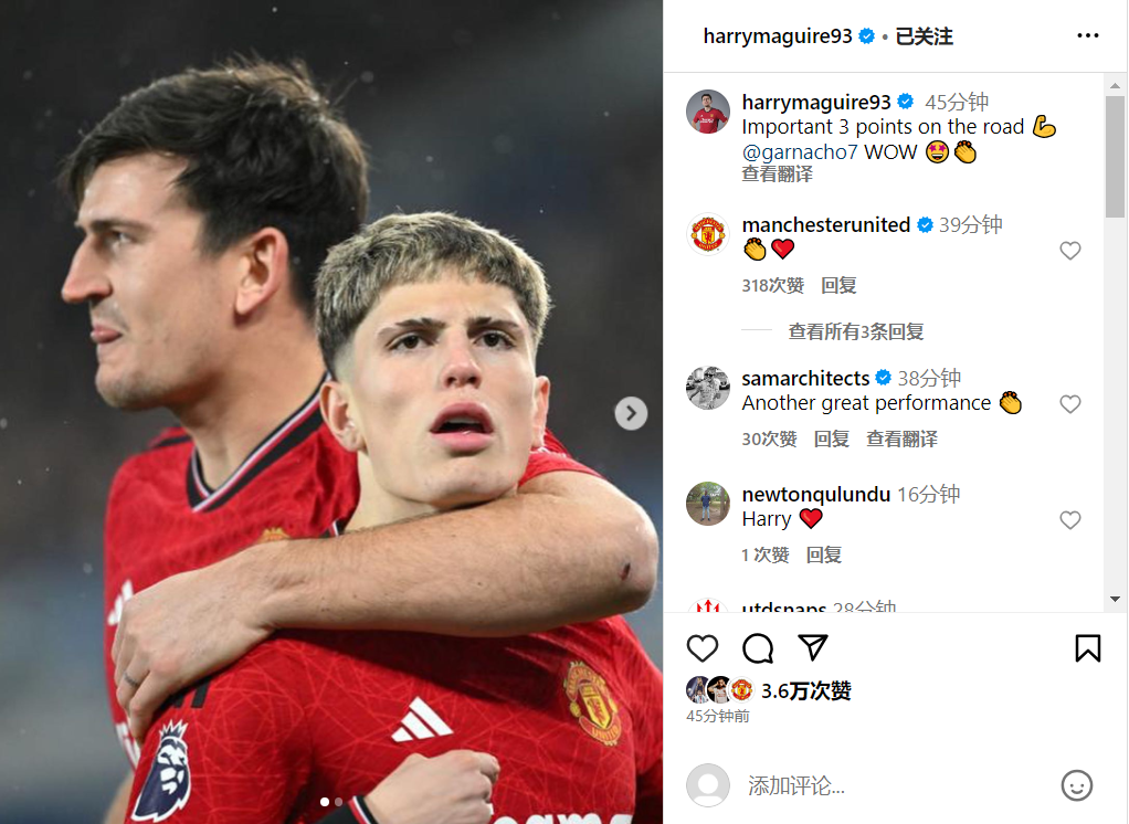 马奎尔晒与加纳乔合影:正确道路上的重要三分,加纳乔太棒了