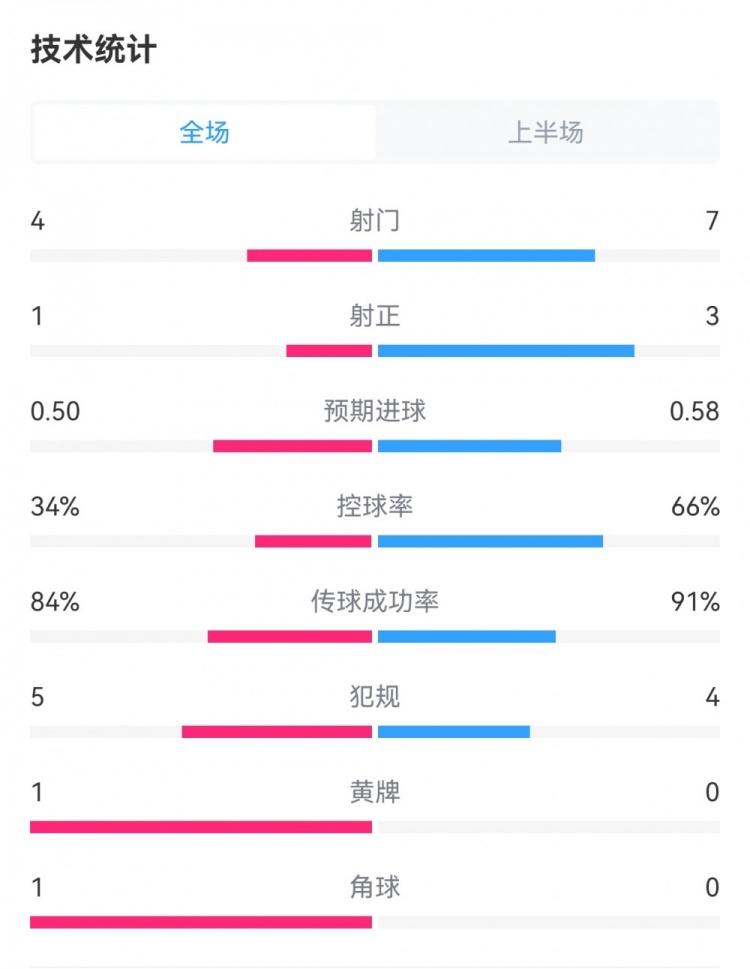 尤文1-1国米半场数据:射门4-7,射正1-3,控球率34%-66%