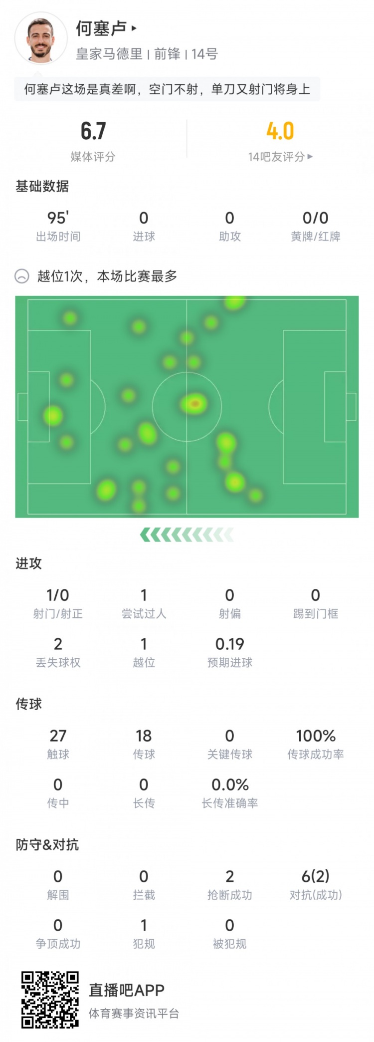 11月27日讯 西甲联赛第14轮,皇马3-0战胜加的斯,本场比赛何塞卢首发出战打满全场,比赛中何塞卢运气不佳,多次错失进球良机。以下为何塞卢本场比赛关键数据:评分:6