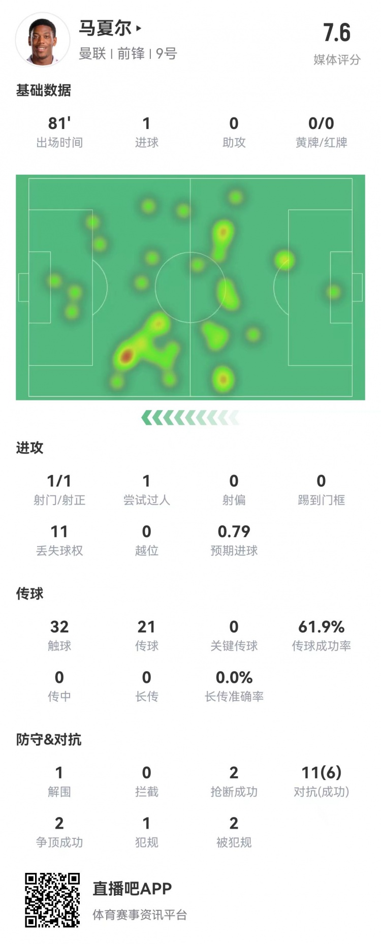 他笑了马夏尔本场数据:1射1正1球1造点 1解围2抢断 评分7.6