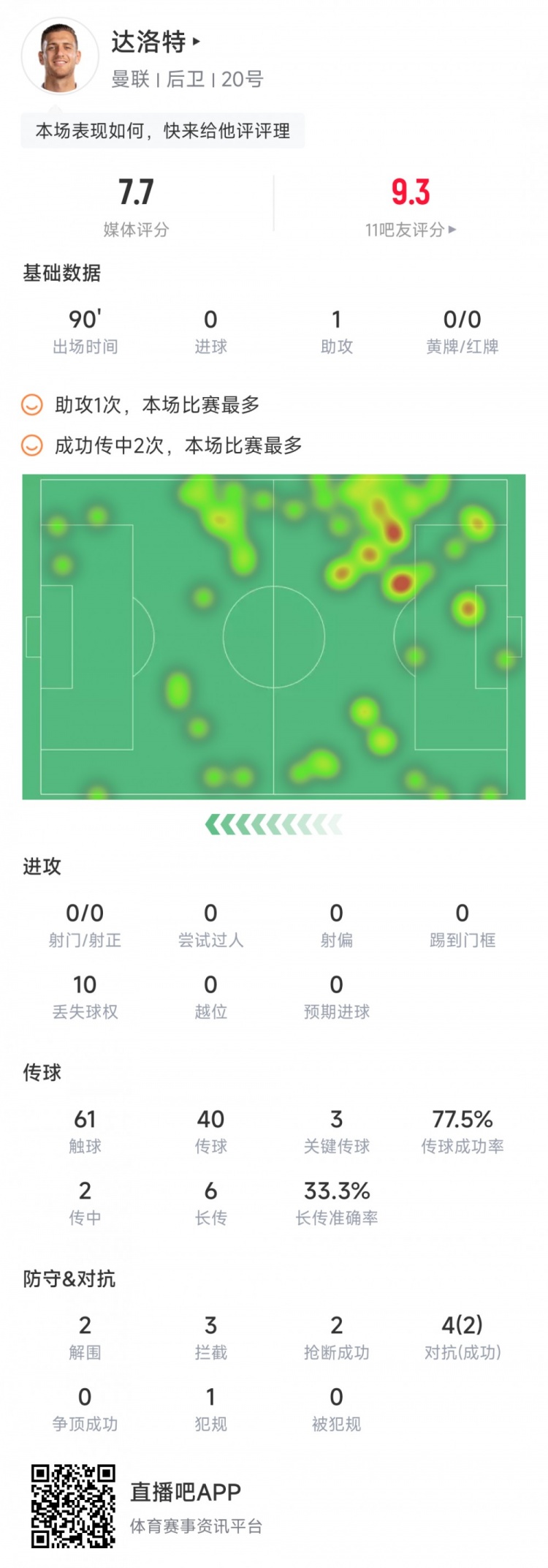 达洛特本场数据:3次关键传球,1次助攻,评分7.7