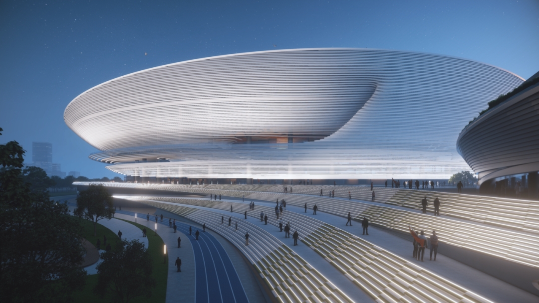 足球场建筑设计十分讲究,汲取了良渚玉璧、径山茶田的特点,形体优美流畅,势同云动、纹比波摇。在场馆顶部,有轻盈的索膜结构屋盖横跨近200米的观众席顶部区域,外部空间通透光洁如玉璧一般。