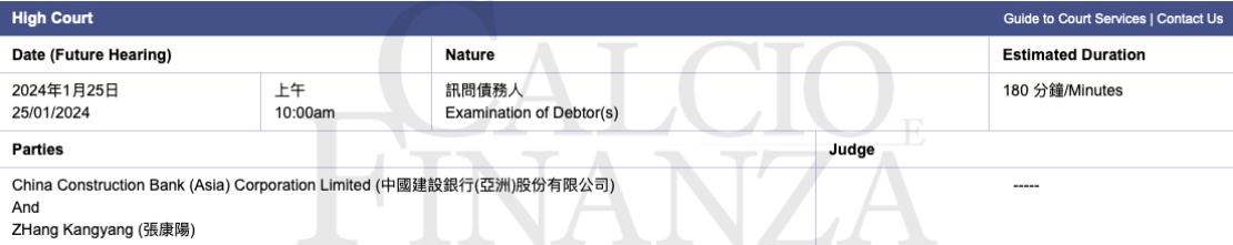 报道称,中国建行此前曾尝试在意大利对张康阳提出诉讼,现在香港法院已经为新的听证会确定了日期,该听证会将于1月25日举行,称为“债务人审查”,为期180分钟。