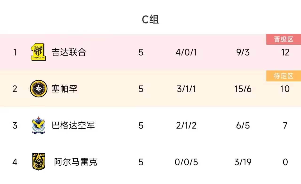 目前,吉达联合4胜1负积12分,位居小组第一。