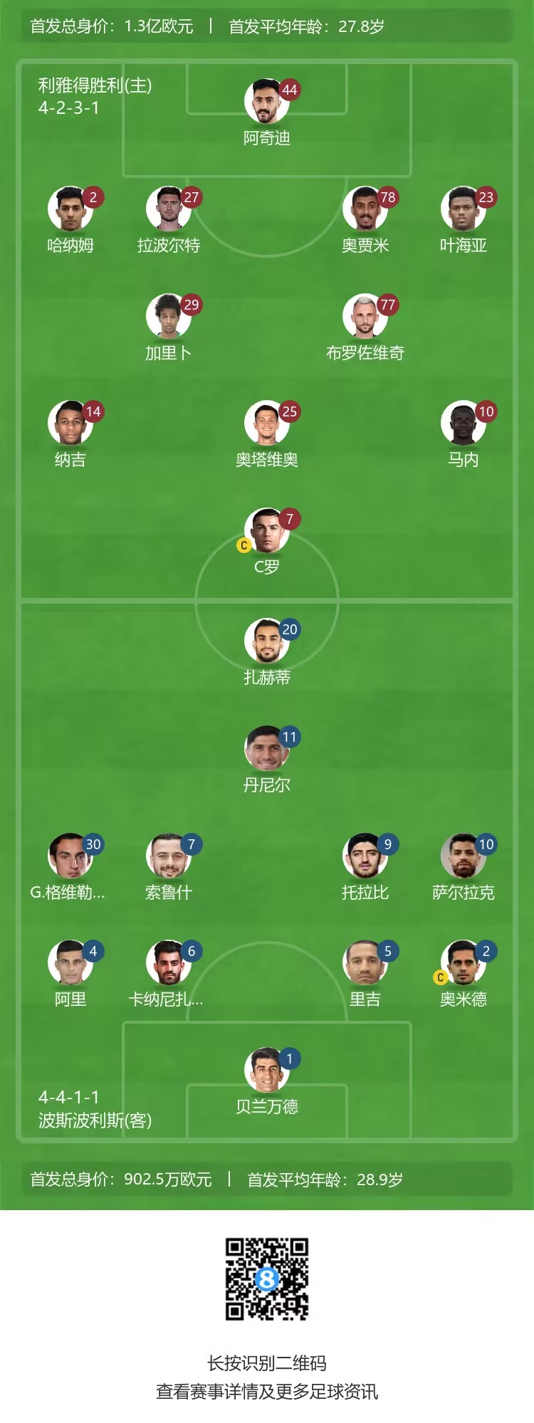 利雅得胜利首发:44-阿奇迪、2-哈纳姆、78-奥贾米、27-拉波尔特、23-叶海亚、25-奥塔维奥、77-布罗佐维奇、14-纳吉、29-加里卜、10-马内、7-C罗