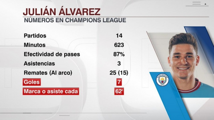 ESPN统计了阿尔瓦雷斯在欧冠的数据,他出战14场欧冠比赛,打进7球并送出3记助攻。