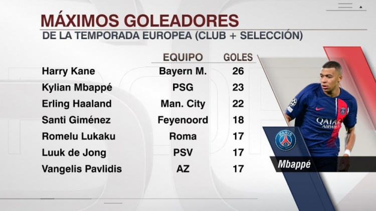 本赛季欧洲俱乐部+国家队射手榜:凯恩26球居首,姆哈二三位