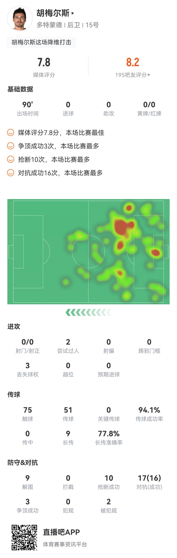 11月29日讯 多特3-1战胜米兰继续排名死亡之组小组第一!本场比赛多特后卫胡梅尔斯交出巅峰表现!9次解围,10次抢断成功,3次争顶成功,17次对抗16次成功!评分7.8全场