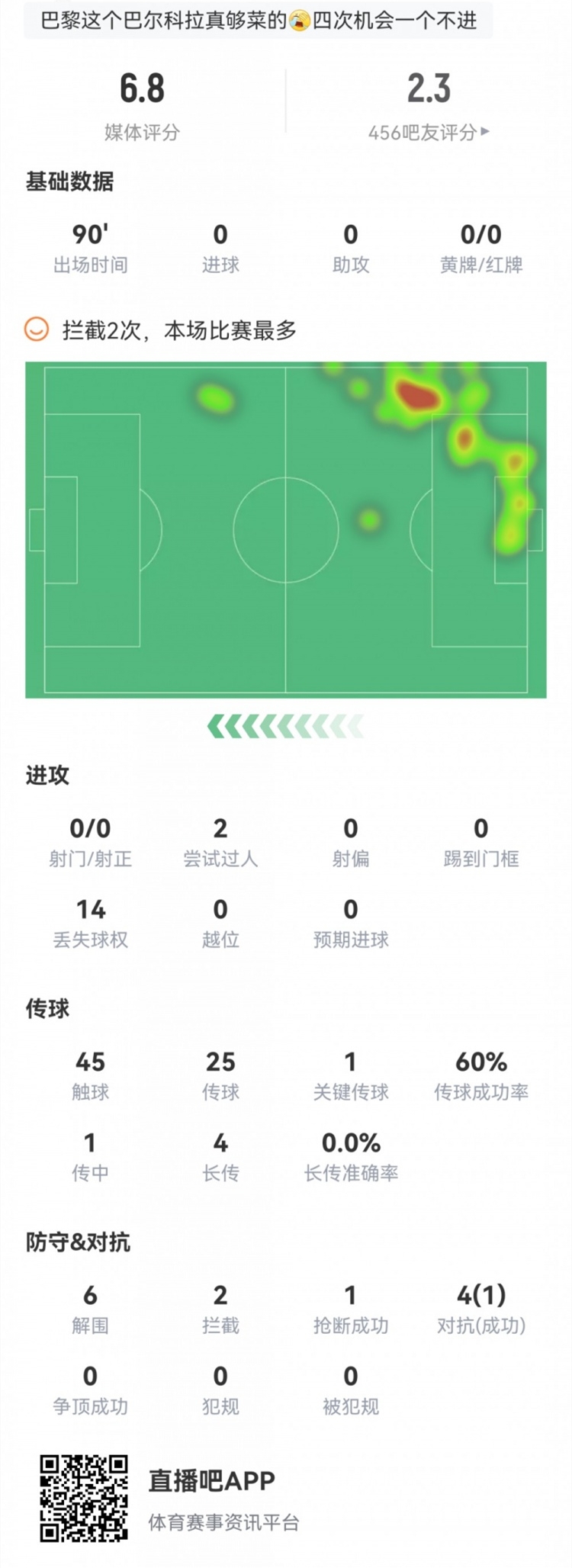 11月29日讯 在本轮欧冠巴黎1-1战平纽卡的比赛中,巴尔科拉替补登场屡次浪费良机,以下为他在本场具体数据: