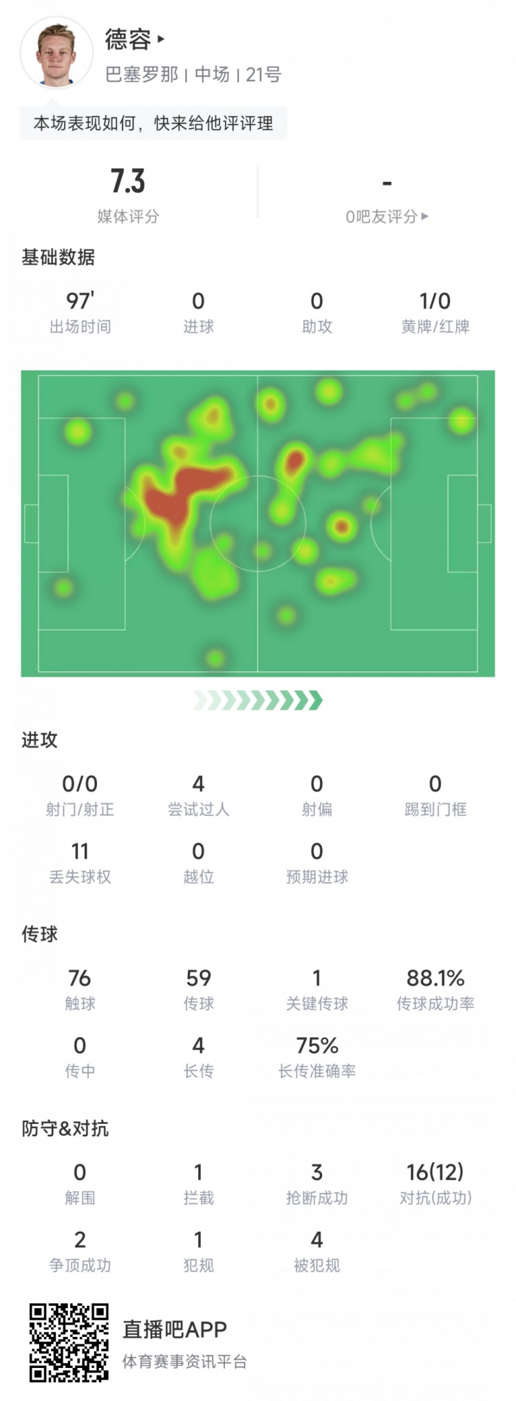 德容本场数据:1次关键传球,3次抢断,12次对抗成功,获评7.3