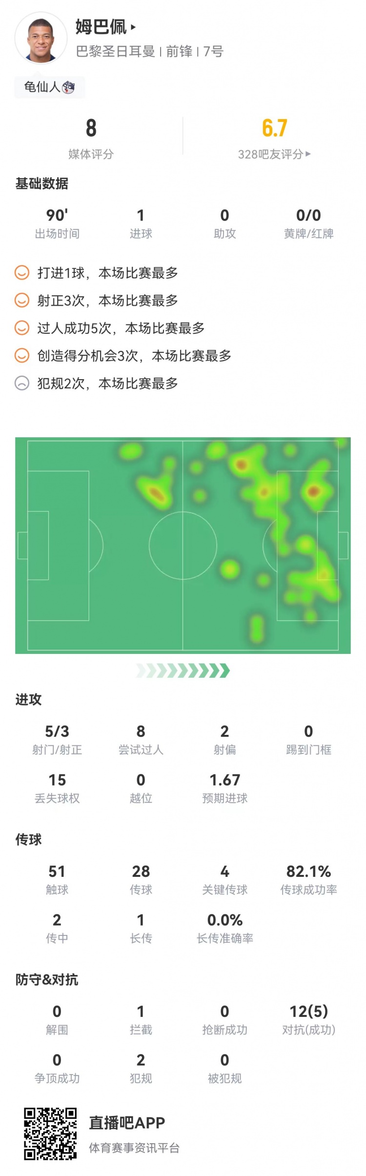 姆巴佩数据:打进绝平点球,8次过人5次成功,创造3次得分机会