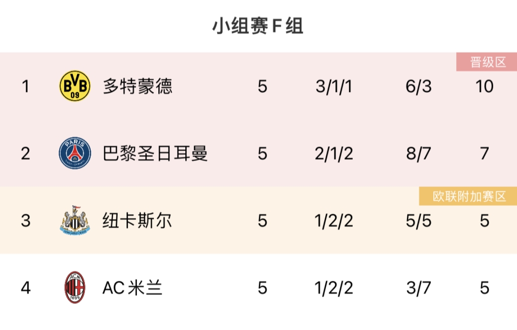 末轮3队死斗F组积分榜:多特出线巴黎第二纽卡米兰同分三四名