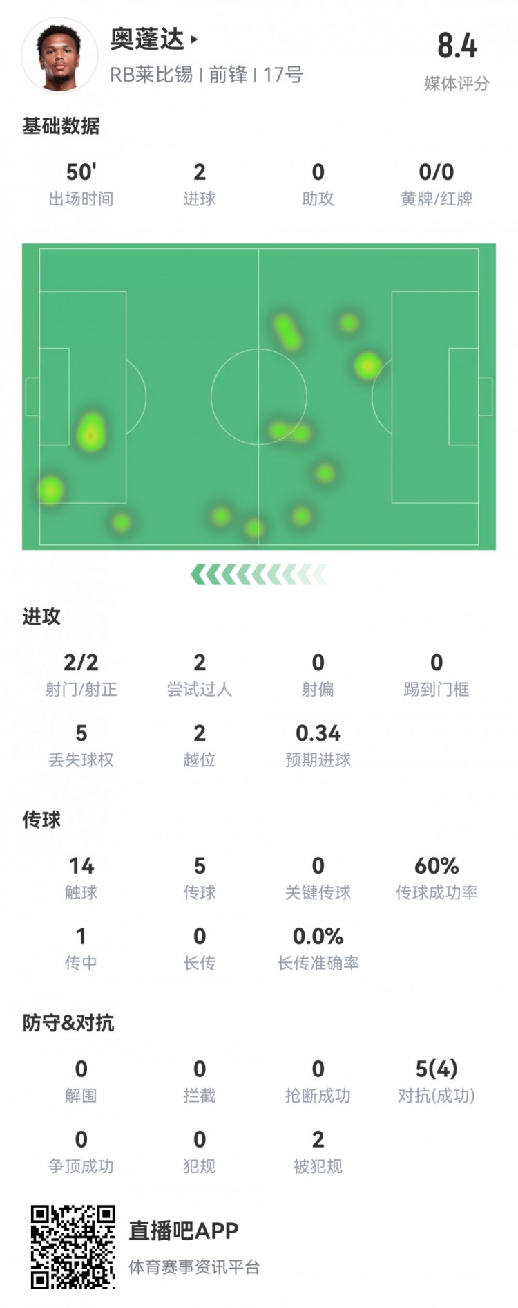 11月29日讯 曼城主场0-2落后莱比锡,23岁的比利时前锋奥蓬达两次精彩单刀破门,球员半场数据如下:2次射正2粒进球2次过人均成功14次触球传球成功率3/5(60%)5次对
