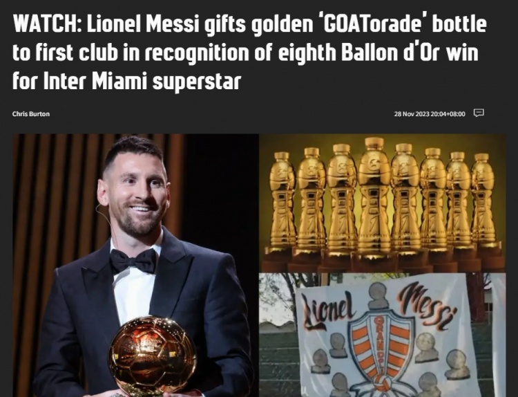11月29日讯 近日,梅西收到了一份特别的礼物:8只黄金打造的佳得乐纪念瓶,这些纪念瓶名为“GOATorade”,由“Gatorade(佳得乐)”与“GOAT”一词融合而成,“8”则代表梅西迄今为止获得的8座金球奖。