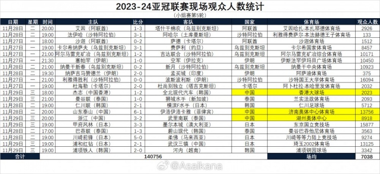 2023-24亚冠联赛现场观众人数统计(小组赛第5轮)