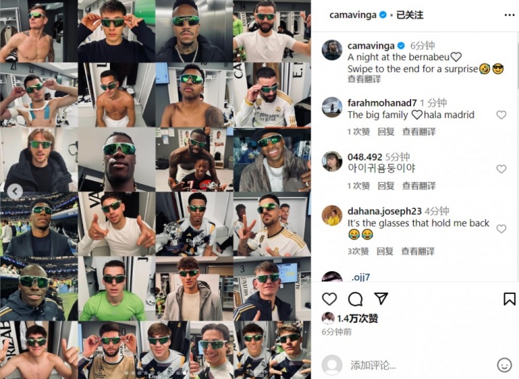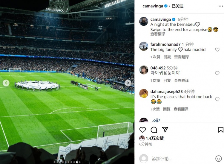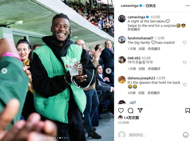 11月30日讯 皇马在本轮欧冠小组赛4-2战胜那不勒斯。此役,卡马文加虽然因伤无法出战,但他依然来现场为球队加油助威,并在赛后更新社交媒体动态庆祝胜利。卡马