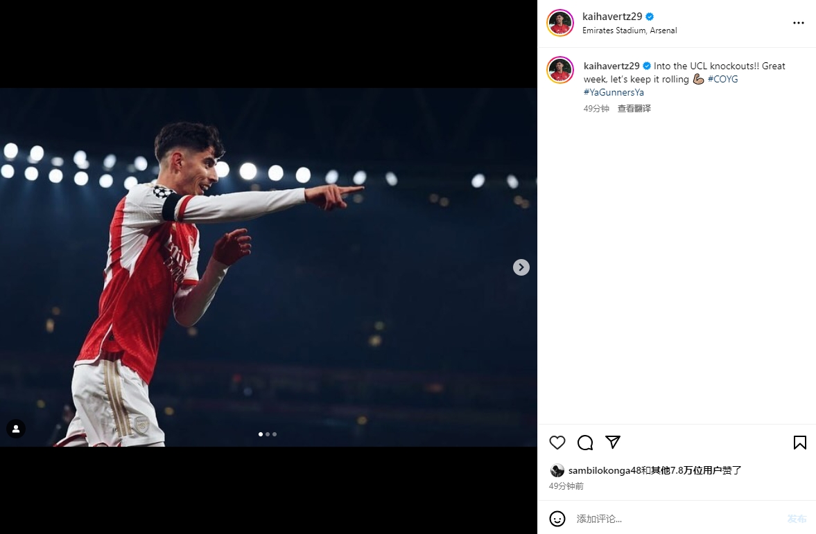 哈弗茨写道:“闯进欧冠淘汰赛!!很棒的一周,让我们再接再厉