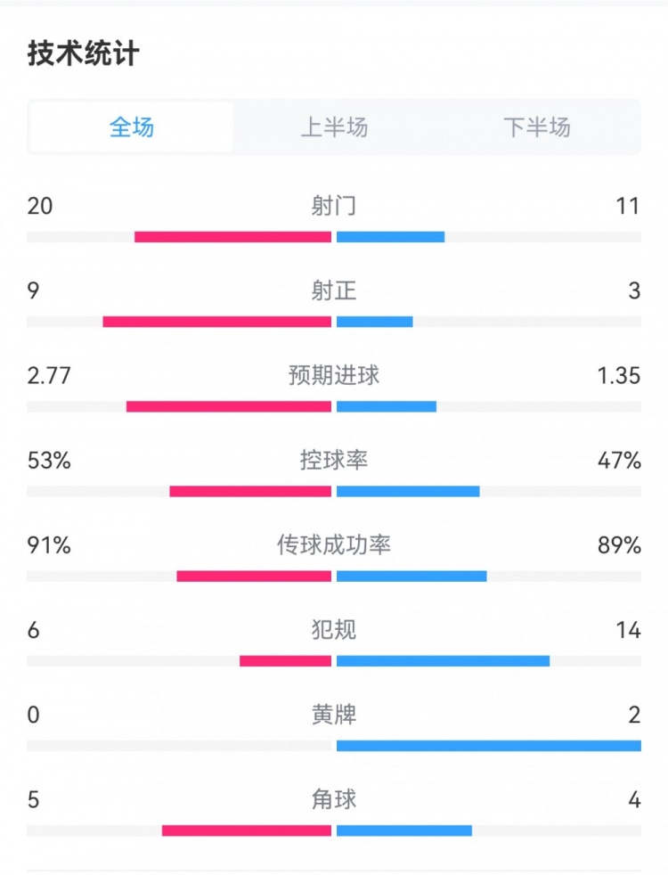皇马4-2那不勒斯数据:射门20-11,射正9-3,控球率五五开