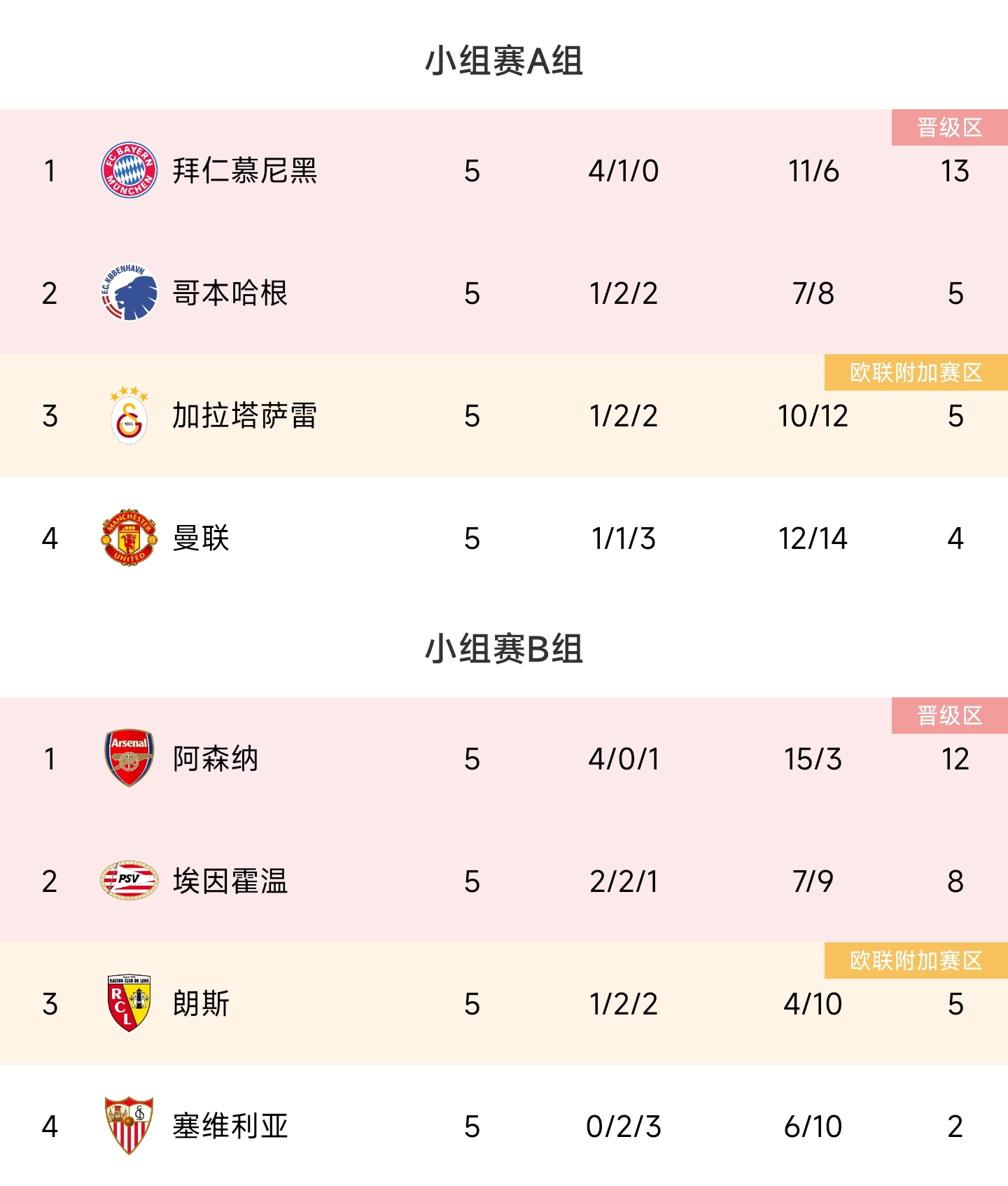 11月30日讯 欧冠小组赛第5轮全部战罢,今日比赛A组加拉塔萨雷3-3曼联、拜仁0-0哥本哈根;B组塞维2-3埃因霍温、阿森纳6-0朗斯,C组皇马4-2那不勒斯、布拉加1-1柏