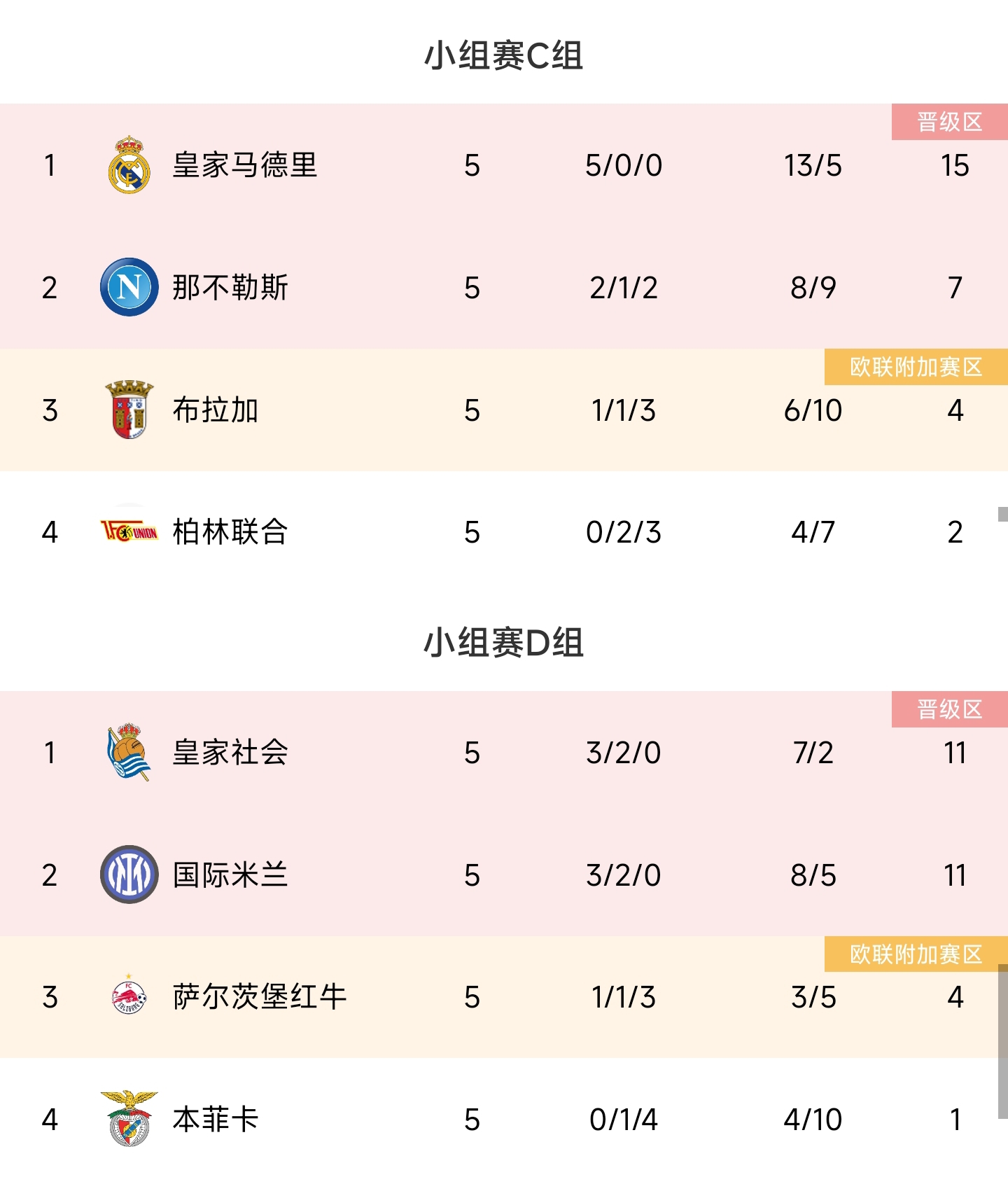11月30日讯 欧冠小组赛第5轮全部战罢,今日比赛A组加拉塔萨雷3-3曼联、拜仁0-0哥本哈根;B组塞维2-3埃因霍温、阿森纳6-0朗斯,C组皇马4-2那不勒斯、布拉加1-1柏林联合,D组本菲卡3-3国米,皇家社会0-0萨尔茨堡。
