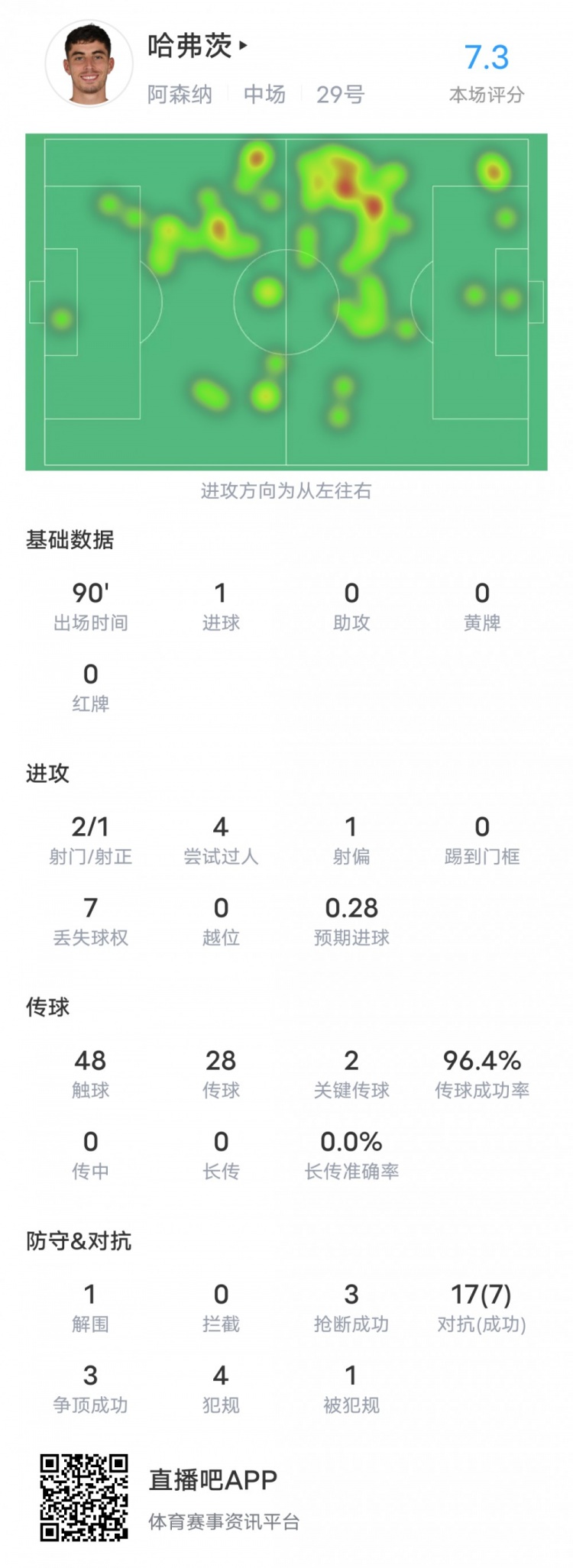 哈弗茨本场对阵朗斯数据:1进球&传球成功率96.4%,评分7.3