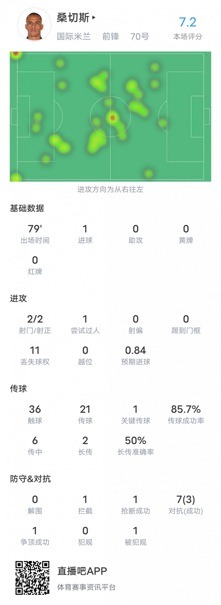 11月30日讯 在对阵本菲卡的欧冠小组赛中,国米攻击手桑切斯首发出战,打进1球,送出1次关键传球,评分7.2。桑切斯本场比赛具体数据如下:上场时间79分钟进球1助攻0