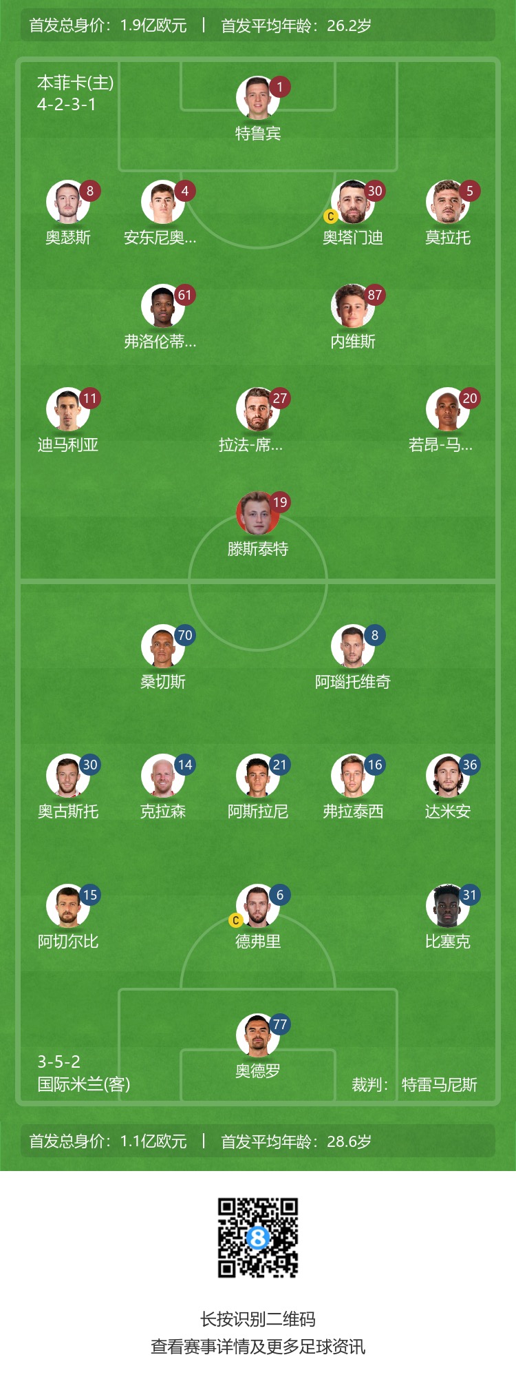 本菲卡小组赛前四轮全败垫底,国米3胜1平已经提前出线。两队历史上共6次交手,国米4胜2平保持不败。