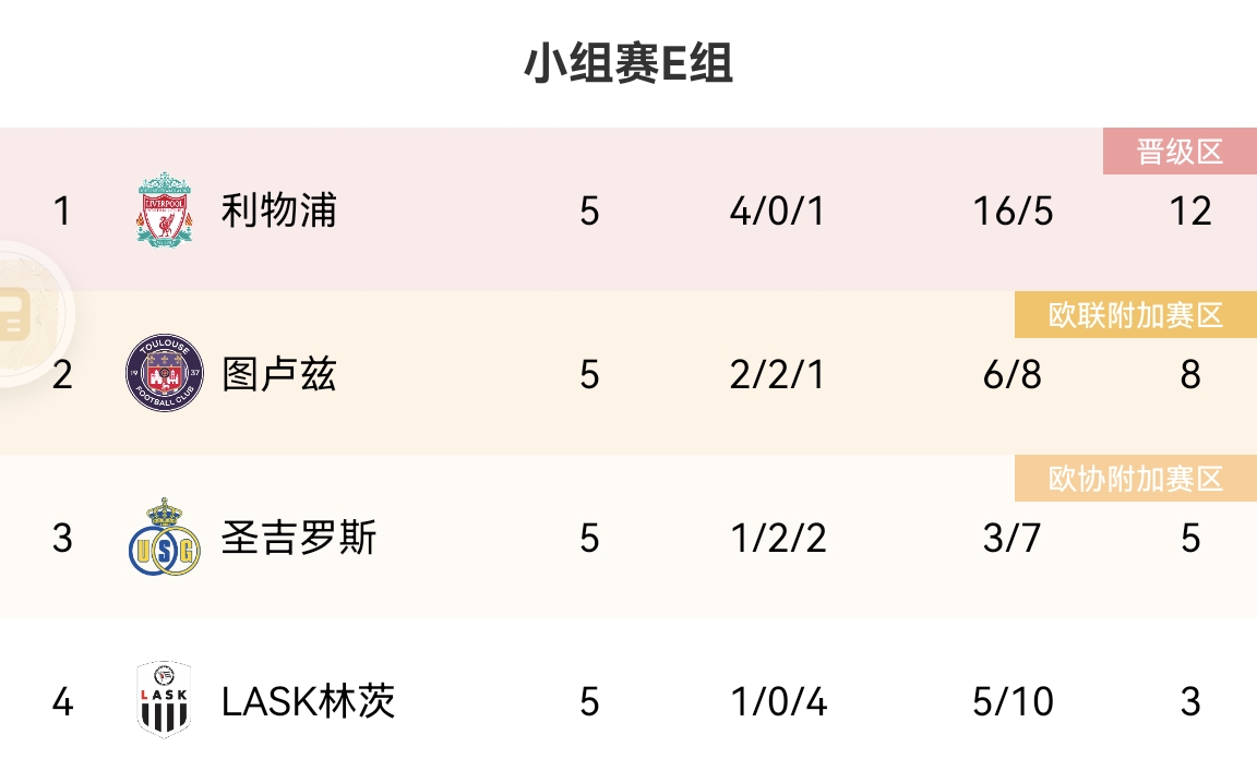 E组积分榜更新,利物浦凭借4胜1负的战绩提前一轮从小组出线,图卢兹2胜2平1负居第二位,圣吉罗斯第三,林茨1胜4负垫底。