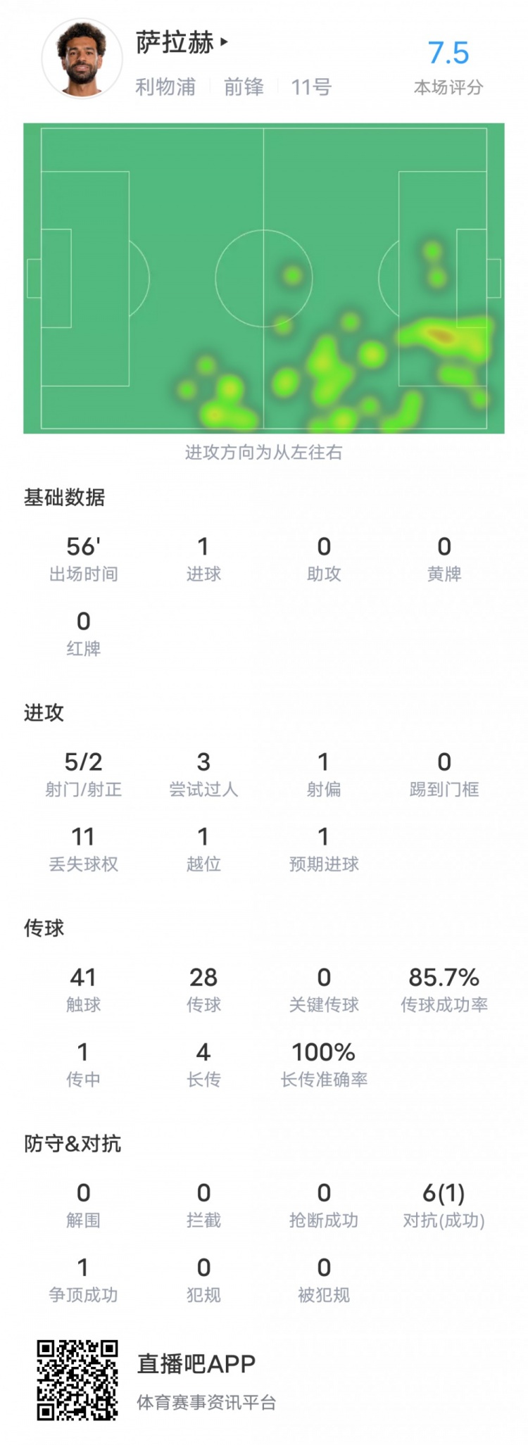 萨拉赫本场对阵林茨数据:1进球+4次长传均成功,评分7.5