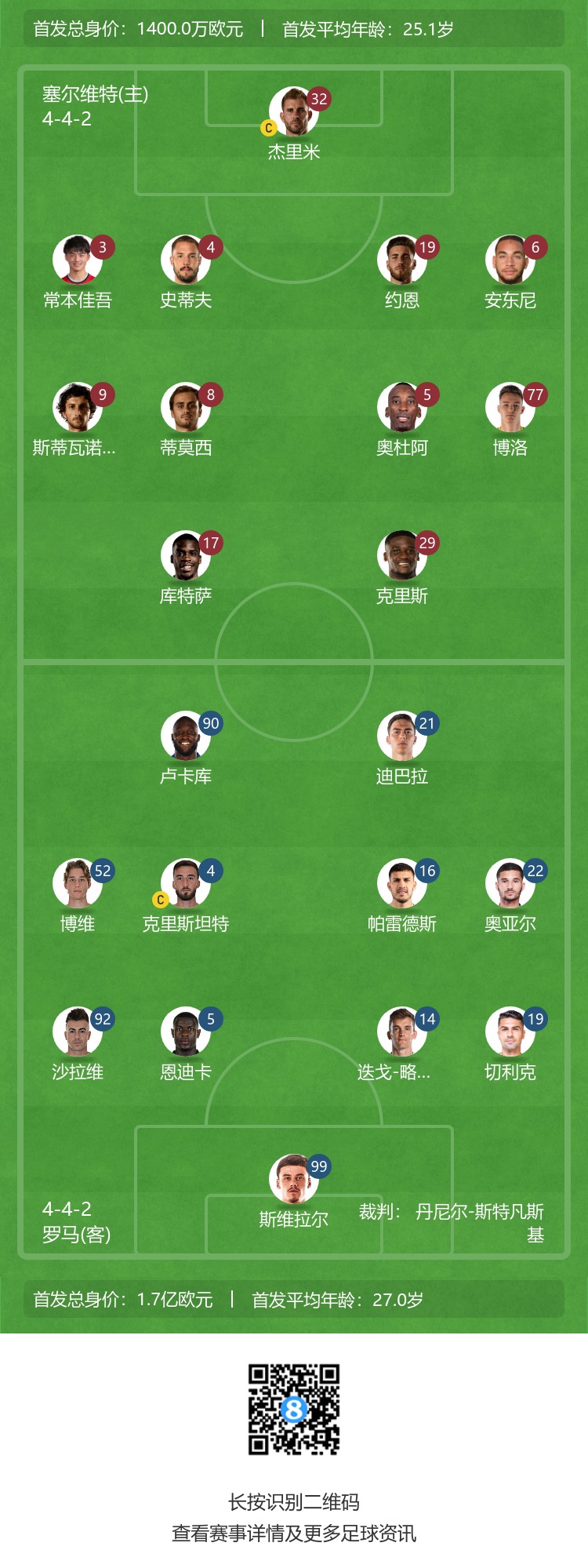 12月1日讯 欧联杯G组第五轮,塞尔维特迎战罗马比赛即将打响。赛前首发出炉。